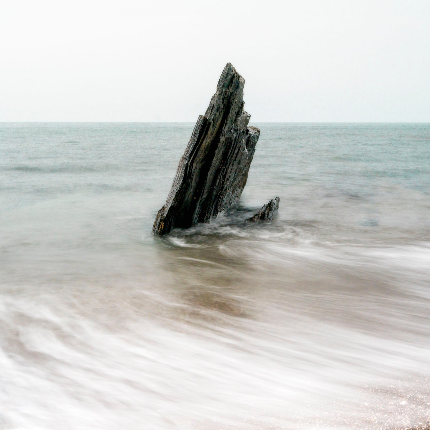 Upon arrival, I hesitated momentarily, contemplating whether to brave the elements or retreat to the warmth of my car. Summoning my courage, I embarked on the half-mile walk to the beach, fully prepared for the wet conditions. The sea greeted me with a mesmerising colour, enhanced by a slight mist from the persistent rain. The sky, though drab and flat, provided a unique backdrop for my intended high-key photography theme.