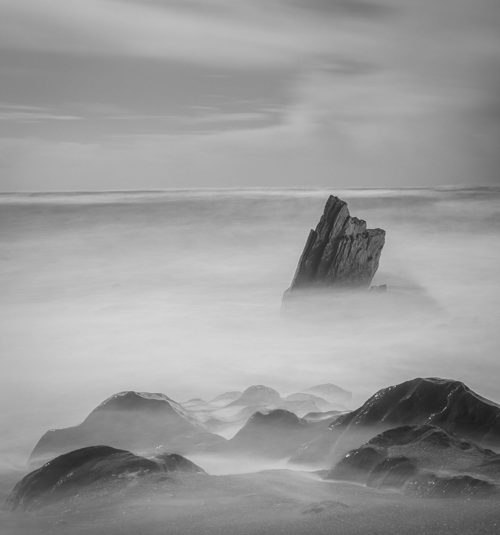 Standing is a monochrome coastal photograph made at Ayrmer Cove. A single rock rises from the water as the sea softens around it, creating a quiet moment of balance and stillness. The long exposure removes distraction, allowing shape, tone, and space to carry the image.